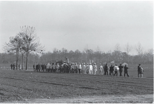 ①龙棺在唢呐声带领下离开村庄(凤翔县)1988年摄