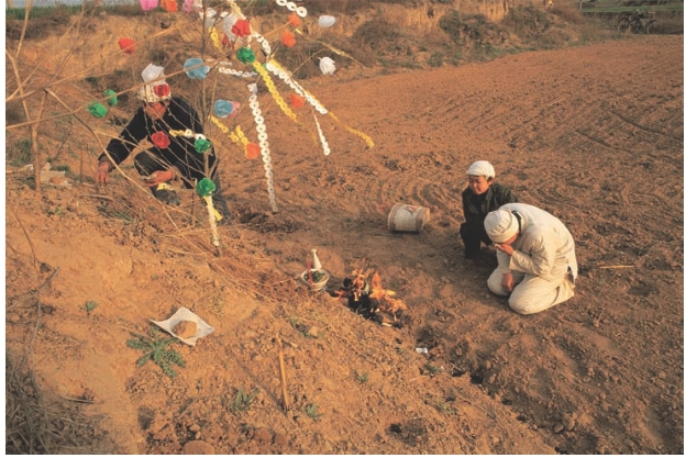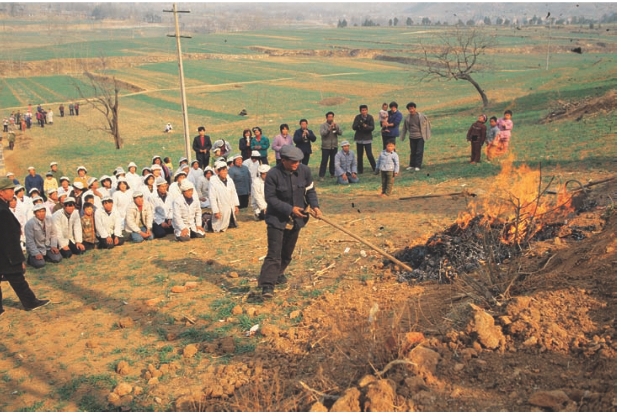 20世纪50年代以来,我国政府致力于殡葬改革,积极推行火葬,督促人民放弃土葬,在大城市取得一定效果。本意上的火葬,确实是利国利民利生态环保的好事情,受到普遍欢迎。尤其是对广大低收入的普通百姓来说,减免了因殡葬带来的极为沉重的经济负担。近年来,随着经济发展,城乡人民收入增长,简洁的火葬仪式变得繁杂起来。除火化尸体与以往不同外,其他土葬程序一律恢复原样,并且更加讲究了。与火葬配套的公墓、陵园建设迅速兴起,仅西安、咸阳、长安、蓝田就兴建了寿阳山、栖凤山、灞陵园、安灵苑、茂陵故园等数十处骨灰安放地,价位3000元至10万元不等。在寿阳山,有一位先富起来的人,买地、立碑、建亭共花了30余万元,成为扫墓祭祖者谈论的热门话题。而今又一个10年过去了,墓地的价格水涨船高,死人与活人争地愈演愈烈。丧葬仪式也越来越隆重,在陵园中,所有墓穴前都立有石碑,小的成尺高,大的2米有余。上边刻有死者姓名、生卒年月,讲究的大石碑背面还刻有死者生平简介。一时间,树碑立传之风吹遍关中大地。除公墓、陵园石碑林立之外,洁净平整的田野上,无论新坟旧墓,旁边统统竖起或水泥或青砖或石刻的碑亭。祭祀者抛弃的五颜六色的塑料袋,被风吹挂在树枝草木间,越积越多,热闹非凡。真不可想象,这些百年难解之物,将给黄土地带来怎样的后果。
