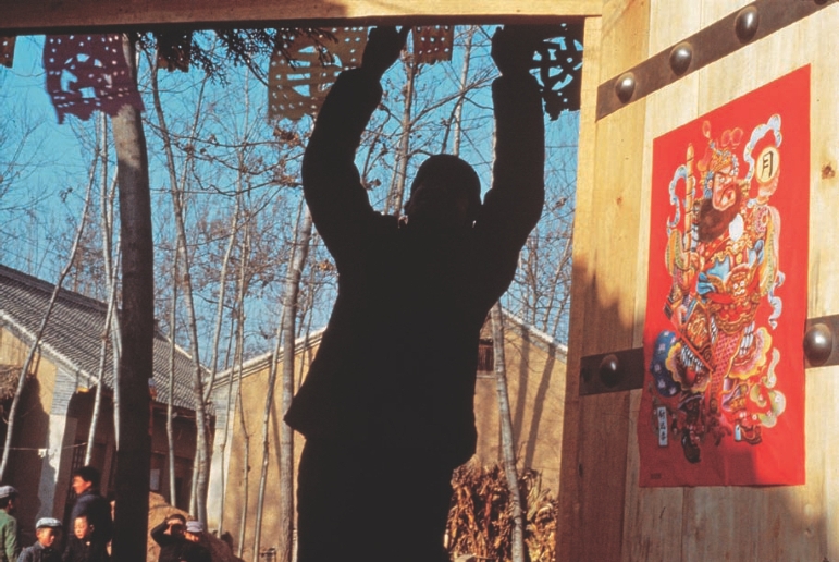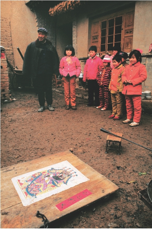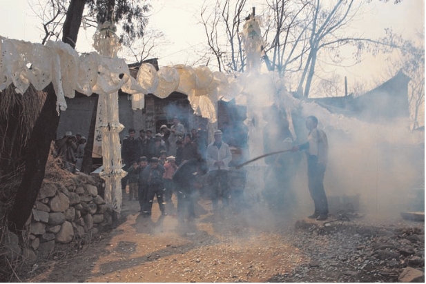 ①家中有人过世,要在门前挂蟒纸。(蓝田县)1986年摄