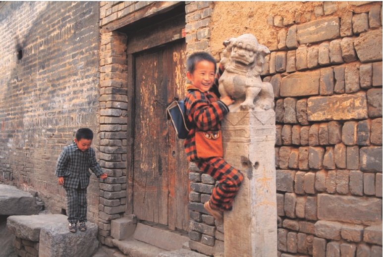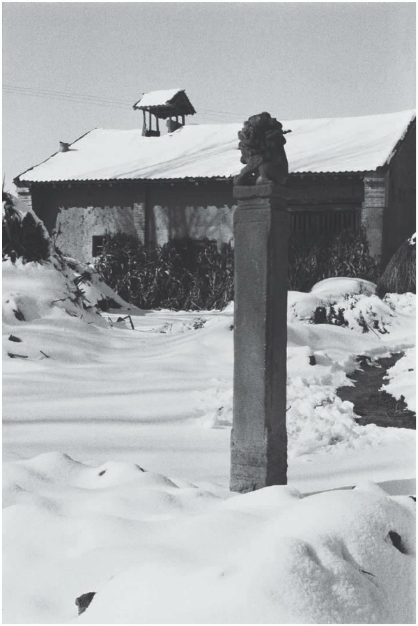 我拍摄拴马桩是在1992年以前,全部是村场院宅现场的自然记录。这些石桩上雕刻的人兽表情丰富,或嬉戏,或恼怒,或凶煞,或虔诚,或媚俗……千姿百态,令人惊叹。我后来得知,陕西省群众艺术馆、西安碑林博物馆开始大量收购拴马桩。2000年,西安美术学院也收购了一批拴马桩,并把它们立在校园里做饰品。紧接着,各地县也如法炮制。一夜之间,渭北高原自然村中数万个拴马桩几乎全部被搬进城里的文化馆内。我照片中老农抱着孩子,依偎在村头拴马桩边晒暖、聊天、享受天伦之乐的自然镜头,再也没有了。