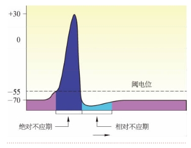 当细胞受到刺激发生兴奋时,它的兴奋性会发生一系列规律性的变化(图2-3-5),其变化规律是:绝对不应期—相对不应期—超常期—低常期—恢复正常。在兴奋最初的一段时间,无论施加多大的刺激,细胞都不会再次兴奋,这段时期称绝对不应期。绝对不应期之后的一段时期内,细胞的兴奋性有所恢复,但仍低于正常,此时须给予阈上刺激才能引起兴奋,这段时期称相对不应期。有些细胞在相对不应期之后,还会出现一段兴奋性轻度增高时期,称超常期。随后出现兴奋性的轻度降低时期,称低常期。