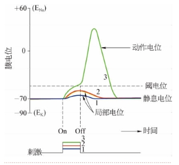 1.阈电位 刺激作用于细胞可以引起动作电位,但不是任何刺激都能触发动作电位。在某些情况下,刺激引起的是细胞膜的超极化,此时细胞的兴奋性低于正常水平。只有当有些刺激引起膜内正电荷增加,静息电位减小(去极化),减小到一个临界值时,细胞膜中大量钠通道才能开放而触发动作电位的产生;这个能触发动作电位的膜电位临界值称阈电位。因此去极化达到阈电位水平是产生动作电位的必要条件。有效刺激就是指作用细胞后能使静息电位去极化达到阈电位的刺激,包括阈刺激和阈上刺激。一般来说,阈电位的数值比静息电位小10~20 mV。例如:神经细胞的静息电位为-70 mV,其阈电位为-55 mV左右。