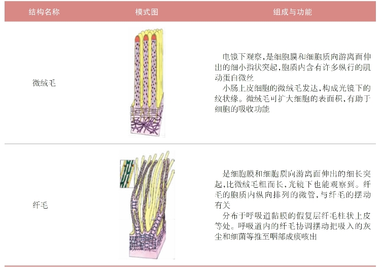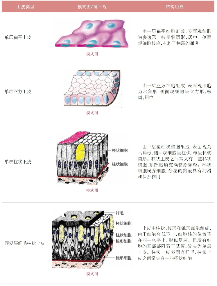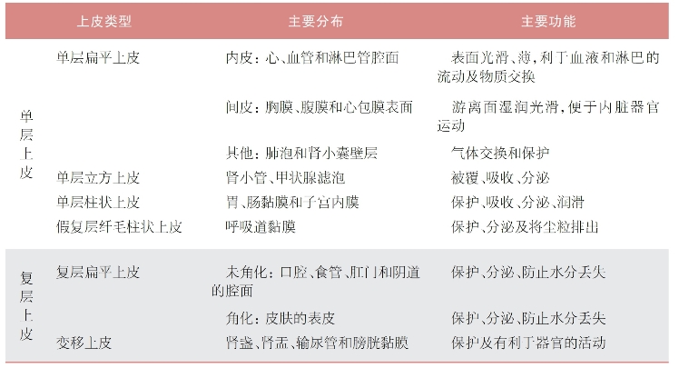 表3-1-1 被覆上皮的类型、主要分布和功能