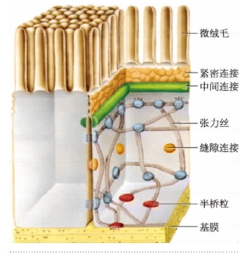3.被覆上皮的基底面 上皮细胞的基底面由基膜、半桥粒和质膜内褶等结构构成。具有支持、连接、扩大细胞基底部接触面积和物质通透等功能。