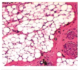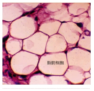脂肪组织由大量的脂肪细胞聚集而成,其间有少量的疏松结缔组织将其分割成脂肪小叶(图3-2-6、图3-2-7)。主要分布在皮下组织、网膜和系膜等处。