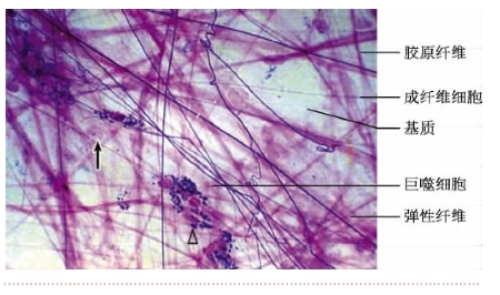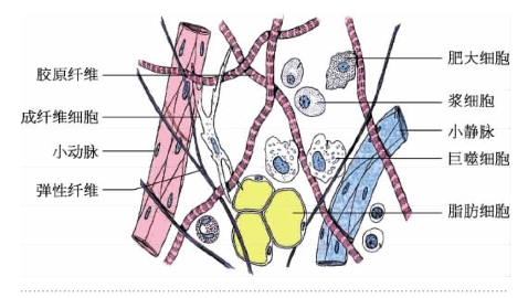 疏松结缔组织是由细胞、基质和纤维构成。其主要的结构特点是细胞少,而基质多,纤维较少且排列稀疏,故称疏松结缔组织(图3-2-1)。该组织在体内分布最广泛。