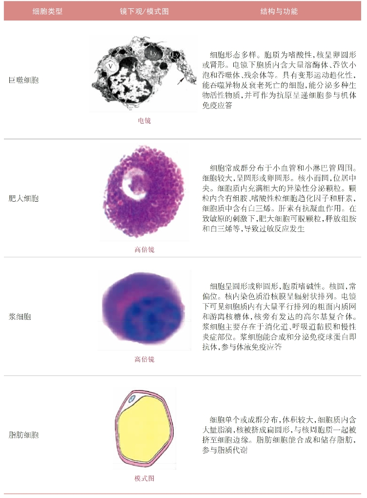 1.细胞 在疏松结缔组织中,虽然细胞数量少,但种类多。有成纤维细胞、巨噬细胞、肥大细胞、浆细胞、脂肪细胞和未分化间充质细胞等(图3-2-2,表3-2-1)。