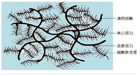 3.基质 疏松结缔组织的基质较多,呈胶态状,充满于细胞和纤维之间,具有一定的黏稠度。基质的化学成分主要由蛋白多糖、糖蛋白和组织液构成。蛋白多糖是由蛋白质与大量糖胺多糖结合的一种大分子复合物。糖胺多糖包括透明质酸、硫酸软骨素和硫酸角质素等,其中以透明质酸含量最多。