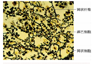 网状组织由网状细胞、网状纤维和基质构成。网状细胞呈星形多突,细胞质为弱嗜碱性,核大着色浅,核仁明显。相邻细胞的突起彼此连接成网(图3-2-8)。网状细胞能产生网状纤维,后者沿网状细胞分布,两者共同构成器官的支架。网状组织主要分布在造血器官和淋巴器官内,构成血细胞和淋巴细胞发育的微环境。