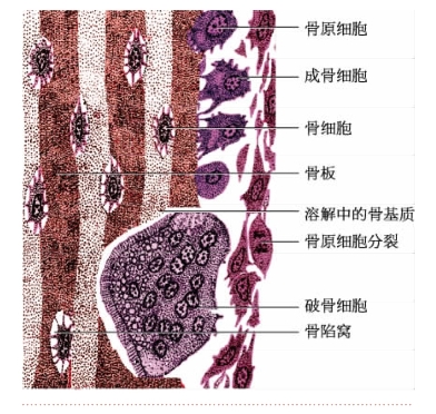 骨组织中的细胞包括骨原细胞、成骨细胞、骨细胞和破骨细胞(图3-2-10)。其中骨细胞的数量最多,位于骨质内,具有成骨作用。破骨细胞常位于骨组织被吸收部位的凹陷处。破骨细胞由许多单核细胞融合而成,故体积较大,多核。破骨细胞可向其内释放蛋白水解酶和乳酸等,溶解骨质,并将被降解成分摄入细胞内以再利用。