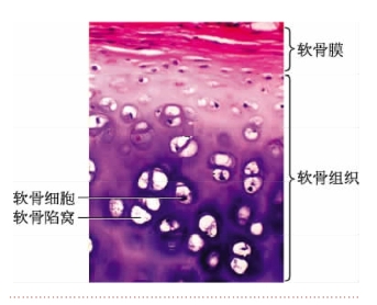 1.软骨组织 由软骨细胞、基质和纤维构成。软骨组织内无血管和神经,软骨细胞所需营养由软骨膜内的血管渗出供给。
