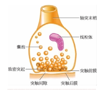 突触是神经元传递信息的重要结构,它是神经元之间,或神经元与非神经元之间相接触的部位。电镜下观察一个经典的突触由突触前膜、突触间隙和突触后膜三部分构成。突触前膜内侧的轴浆内,含有大量囊泡,内含高浓度的神经递质。在突触后膜上则存在着相应神经递质的特异性受体。突触前膜和后膜之间的间隙称突触间隙(图3-3-6)。
