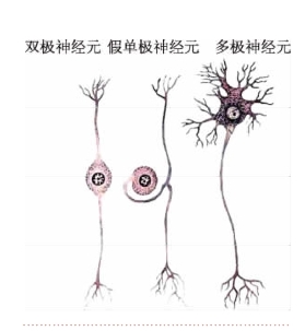 1.按神经元突起的数目 可将神经元分为3类:①多极神经元:有一个轴突,多个树突,如脊髓前角运动神经元。②双极神经元:有一个轴突,一个树突,如耳蜗神经节内的双极神经元。③假单极神经元:从胞体只发出一个突起,但离胞体不远处,突起即分为两支,周围突和中枢突(图3-3-4)。