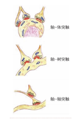 突触的分类方式有很多种:①根据突触接触的部位不同,可将经典的突触分为轴突-胞体式突触、轴突-树突式突触和轴突-轴突式突触等3类(图3-3-7)。②按对突触后神经元的作用方式不同,可分为电突触和化学突触。③按突触传递产生的效应不同,可将突触分为兴奋性突触和抑制性突触两类。