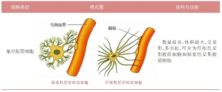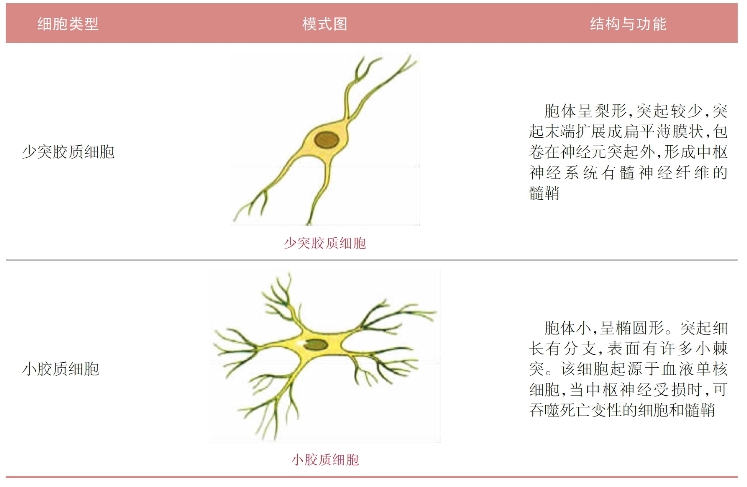 中枢神经系统的胶质细胞由星形胶质细胞、少突胶质细胞、小胶质细胞组成(表3-3-1)。