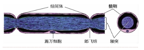1.神经膜细胞 又称施万细胞,细胞排列成串,一个连一个地包裹在轴突的表面,形成周围神经系统有髓神经纤维的髓鞘(图3-3-8)。