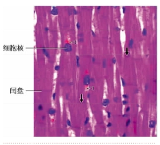 心肌纤维呈短柱状(图3-4-5),有分支,相互连接成网,其连接处染色较深,称闰盘。心肌纤维通常有一个椭圆形核,位居中央,偶见双核。心肌纤维也有横纹,但不如骨骼肌的明显。