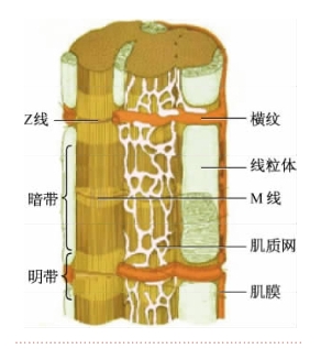 心肌纤维的超微结构与骨骼肌纤维类似,但具有下述特点:①肌原纤维被肌质分割成粗细不等的束,故心肌纤维的横纹不明显。②横小管较粗,位于Z线水平。③肌质网稀疏,终池小而少,常与横小管形成二联体(图3-4-6)。6)④闰盘为心肌特有的结构,该处有缝隙连接,能在心肌纤维间迅速传递电兴奋,以保证心肌的同步收缩。