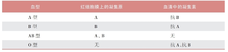 人体不同血型的血清中含有不同的能与红细胞膜上的凝集原发生反应的特异性抗体,称凝集素,但不含有对抗其自身红细胞凝集原的凝集素。例如,在A型血的血清中只含有抗B凝集素;B型血的血清中只含有抗A凝集素;AB型血的血清中,一般没有抗A和抗B凝集素;而O型血的血清中则含有抗A和抗B凝集素(表4-5-1)。