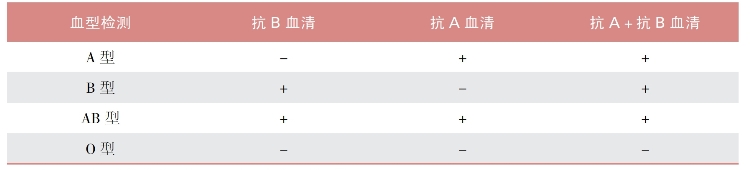 临床上ABO血型的鉴定方法,是用已知的标准A型血清(含抗B凝集素)和B型血清(含抗A凝集素),分别与被鉴定人的红细胞悬液混匀,依其发生凝集反应的结果,判定被鉴定人红细胞膜上所含的凝集原,再根据所含凝集原确定血型(表4-5-2)。