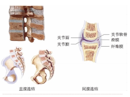 1.直接连结 骨与骨之间借致密结缔组织、软骨或骨直接相连。其间没有腔隙,运动度小或不能运动,如颅骨之间的缝、椎骨之间的连结等。