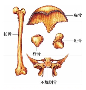 成人约有206块骨,全身骨按部位分为颅骨、躯干骨和四肢骨,前两者合称中轴骨(图5-1-1)。骨按形态分为长骨、短骨、扁骨和不规则骨(图5-1-2)。