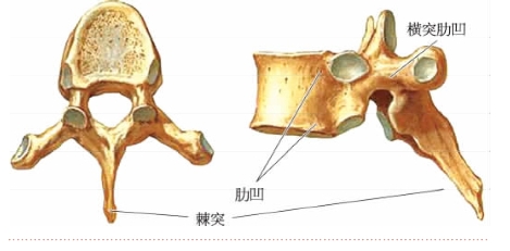 2)胸椎(图5-1-11):椎体横断面呈心形,12个椎体从上向下逐渐增大;椎孔相对较小,呈圆形;棘突细长向后下方倾斜,呈叠瓦状排列;胸椎两侧与肋骨相连接,故椎体两侧的上、下和横突末端均有小的关节面,分别称上肋凹、下肋凹和横突肋凹。