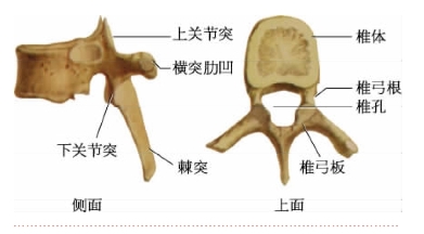 椎弓是附在椎体后方的弓状骨板,它与椎体共同围成椎孔,所有椎孔相互连通形成椎管,其内容纳脊髓。椎弓与椎体相连接的部分较细称椎弓根,其上方有较浅切迹称椎上切迹,其下方有较深切迹称椎下切迹。相邻椎骨的上、下切迹围成椎间孔,孔内有脊神经和血管通过。椎弓后部宽厚呈板状称椎弓板,从椎弓板上发出7个突起:棘突1个,正中向后突起;横突1对,向两侧突起;上关节突1对,从椎弓根和椎弓板结合处向上突起;下关节突1对,从椎弓根和椎弓板结合处向下突起。相邻椎骨的上、下关节突构成关节(图5-1-6)。