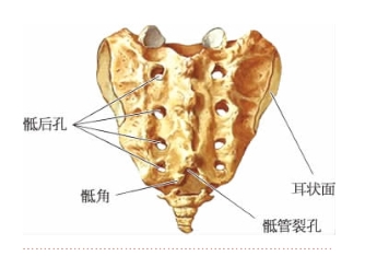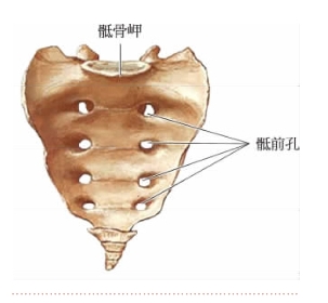 4)骶骨:成人骶骨呈倒三角形,由5块骶椎融合而成。分骶骨底、侧部、骶骨尖、盆面和背侧面(图5-1-13、图5-1-14)。