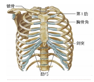 (1)胸廓的整体观:成人胸廓近似圆锥形,上窄下宽,横径大于前后径。胸廓上口由胸骨柄上缘、第1对肋及第1胸椎体围成,向前下倾斜,为颈部与胸腔的通道。胸廓下口由胸骨剑突、肋弓、第11肋前端、第12肋及第12胸椎围成。左、右两侧肋弓之间的夹角,称胸骨下角。相邻两肋之间的间隙,称肋间隙(图5-1-19)。