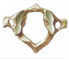 第1颈椎:又称寰椎(图5-1-8)。呈环状,无椎体、棘突和关节突,由前弓、后弓和两个侧块组成。侧块上面各有一椭圆形的关节面,与颅骨枕髁形成寰枕关节。