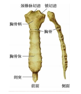 2.胸骨 胸骨位于胸前壁正中,前凸后凹,自上而下分为胸骨柄、胸骨体和剑突三部分。胸骨柄与胸骨体连接处微向前的突起,称胸骨角,两侧平对第2肋,是计数肋的重要体表标志。胸骨角向后平对第4胸椎体下缘(图5-1-18)。