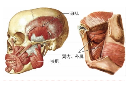 2.咀嚼肌 咀嚼肌(图5-2-7)共4对,包括颞肌、咬肌、翼内肌和翼外肌。它们分布于下颌关节周围,参加咀嚼运动。