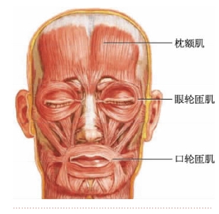 1.面肌 面肌(图5-2-6)起自颅骨,止于面部皮肤,分布于眼裂、口裂和鼻孔周围。有环形肌和辐射肌两种,收缩时使孔裂开大或闭合,同时牵动皮肤,显示出各种不同表情,故又称表情肌。