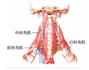 2.颈深肌 颈深肌群位于颈椎两侧,包括前斜角肌、中斜角肌、后斜角肌,三者均起自颈椎横突。前、中斜角肌止于第1肋,并与第1肋围成三角形间隙,称斜角肌间隙,锁骨下动脉和臂丛由此进入腋窝。