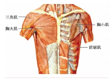 1.胸大肌 位于胸前壁浅层(图5-2-11)。作用:使肩关节内收、内旋和前屈,如上肢固定,可上提躯干;还可提肋,助吸气。