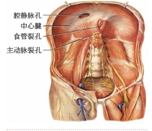 膈(图5-2-13)为分隔胸、腹腔的一块扁肌,向上膨隆,呈穹隆状。其周围部分为肌质,肌纤维走向中央移行为腱膜,称中心腱。膈有3个裂孔:在第12胸椎前方,左、右膈脚与脊柱之间有主动脉裂孔,有主动脉和胸导管通过;在主动脉裂孔的左前上方,约在第10胸椎水平有食管裂孔,有食管和迷走神经前、后干通过;在主动脉裂孔的右前上方,在第8胸椎水平有腔静脉孔,有下腔静脉通过。