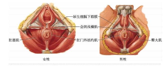 会阴肌为封闭骨盆下口诸肌,又称盆底肌(图5-2-16),主要有肛提肌,会阴浅、深横肌,尿道括约肌等。