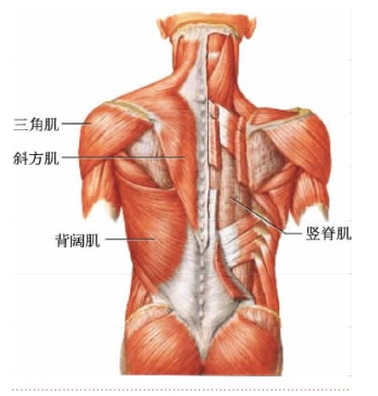 背肌(图5-2-10)分浅、深两群。浅群多为扁肌,有斜方肌、背阔肌。深群主要为竖脊肌。