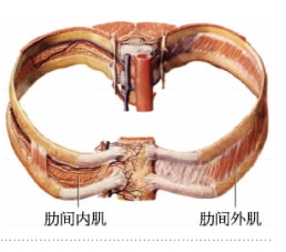 2.肋间外肌、肋间内肌 位于肋间隙的浅、深层(图5-2-12)。作用:提肋助吸气和降肋助呼气。