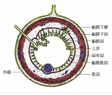 3.黏膜肌层 通常由内环行和外纵行两薄层平滑肌组成,其收缩可促进固有层内的腺体分泌和血液运行,有利于物质的吸收和转运。