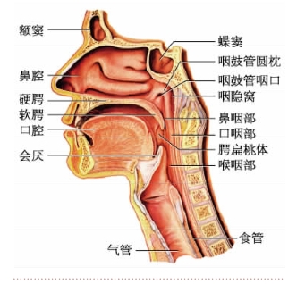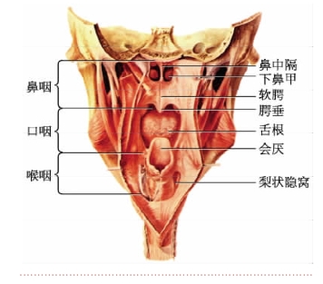 1.鼻咽 位于鼻腔的后方,介于颅底与软腭之间,向前经鼻后孔通鼻腔,向下续于口咽部。在鼻咽的两侧壁相当于下鼻甲后方1 cm处各有咽鼓管咽口。咽鼓管咽口的前、上和后方有明显的弧形隆起称咽鼓管圆枕。咽鼓管圆枕与咽后壁之间有一纵行深窝称咽隐窝,是鼻咽癌的好发部位。