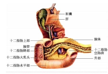 1.上部 在第1腰椎右侧,起自胃的幽门,水平行向右后方,至肝门下方急转向下移行为降部,上部与降部转折处为十二指肠上曲。十二指肠起始处管壁较薄,管径大,黏膜面较光滑无环状襞,故临床常称此段为十二指肠球,是十二指肠溃疡及穿孔的好发部位。