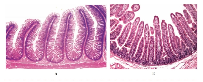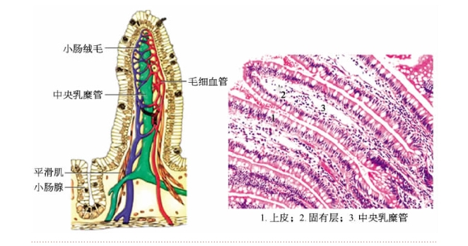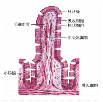 2)固有层:有1~2条纵行分布的毛细淋巴管,称中央乳糜管,管壁衬有内皮,通透性大,是乳糜微粒进入淋巴管的重要通道。在乳糜管周围有丰富的有孔毛细血管,上皮细胞吸收的氨基酸和单糖等经此入血。