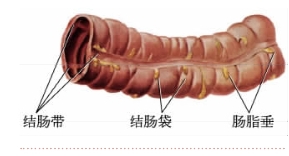大肠管径较粗,肠壁较薄,除直肠、肛管与阑尾外,盲肠和结肠具有三个特征性结构,即结肠带、结肠袋、肠脂垂(图6-2-23)。结肠带有3条,由肠壁的纵行肌增厚而成,沿大肠的纵轴排列,三条结肠带均汇集于阑尾根部;结肠袋的形成是由于结肠带较肠管短,使肠管形成许多向外膨出的囊状突起;肠脂垂为沿结肠带两侧分布的许多脂肪突起。这三种特征性结构是区别大肠和小肠的标志。