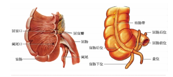 阑尾呈细长状,形似蚯蚓,是附属于盲肠的一段肠管,其根部较固定,连于盲肠的后内侧壁(图6-2-24);远端为游离的盲端,位置不固定。由于三条结肠带均在阑尾根部集中,故沿结肠带向下追踪,是手术寻找阑尾的可靠方法。