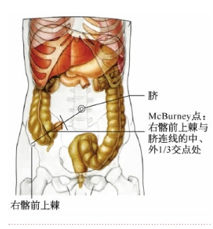 阑尾根部的体表投影,通常在脐与右髂前上棘连线的中、外1/3交点处,该点称麦氏点(McBurney点)(图6-2-25)。急性阑尾炎时,此点附近有明显的固定性压痛,对诊断具有重要的价值。