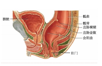 直肠下段肠腔膨大称直肠壶腹。直肠内面常有上、中、下3个直肠横襞,由黏膜和环形肌形成。其中最大而且恒定的一个直肠横襞位于直肠右侧壁上,距肛门约7 cm,可作为直肠镜检查的定位标志。