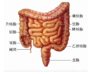 大肠围绕于空、回肠的周围,上接回肠,终于肛门,全长约1.5 m。分为盲肠、阑尾、结肠、直肠和肛管五部分。大肠的主要功能是吸收水分,分泌黏液,并将食物残渣形成粪便,排出体外。