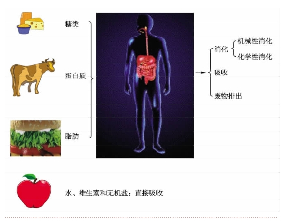人体在进行新陈代谢过程中必须不断地从外界摄入营养物质,包括糖类、蛋白质、脂肪、维生素,以及水和无机盐。人体利用这些物质合成自身的组织,并提供维持机体活动的能量。食物是人体所需营养物质的来源。其中糖类、蛋白质、脂肪必须在消化系统中消化,分解成小分子物质才能被吸收进入体内。消化系统的主要生理功能就是对食物进行消化和吸收,为人体提供营养物质、水和电解质,以保证新陈代谢的需要(图6-4-1)。